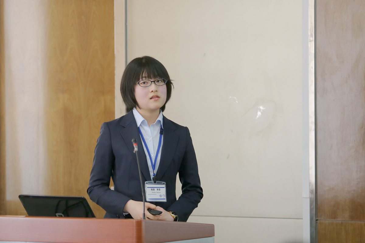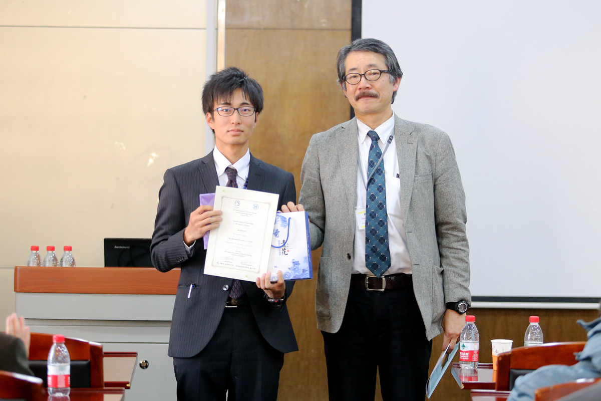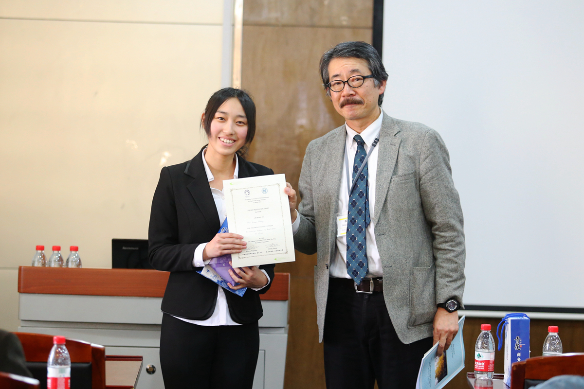 副院长李宏煦、陈骏,青年教师杨文等参加学生研习交流活动并进行指导。日方学生渡边千宽引导在场的同学们走进五彩斑斓的金属薄膜色彩世界,西村肇伦介绍了利用花瓣色素制成太阳能电池的原理,山田加奈子展示了用电化学方法在钛金属表面绘画的全过程,日方学生的创意和思路赢得中方师生的赞赏。我校学生张亚菲运用电镜图片介绍了非金属夹杂物对钢铁疲劳性能的影响,李瑶介绍了对高铝低密度钢组织和性能的研习情况,黄心眉以科学视角介绍了中国农村的环境污染现状,中方学生的踏实和细致赢得了日方师生的肯定。在交流活动中,同学们认真聆听,踊跃提问,相互学习,取长补短。长坂也教授为获得本次交流活动优秀奖的两校学生颁奖。