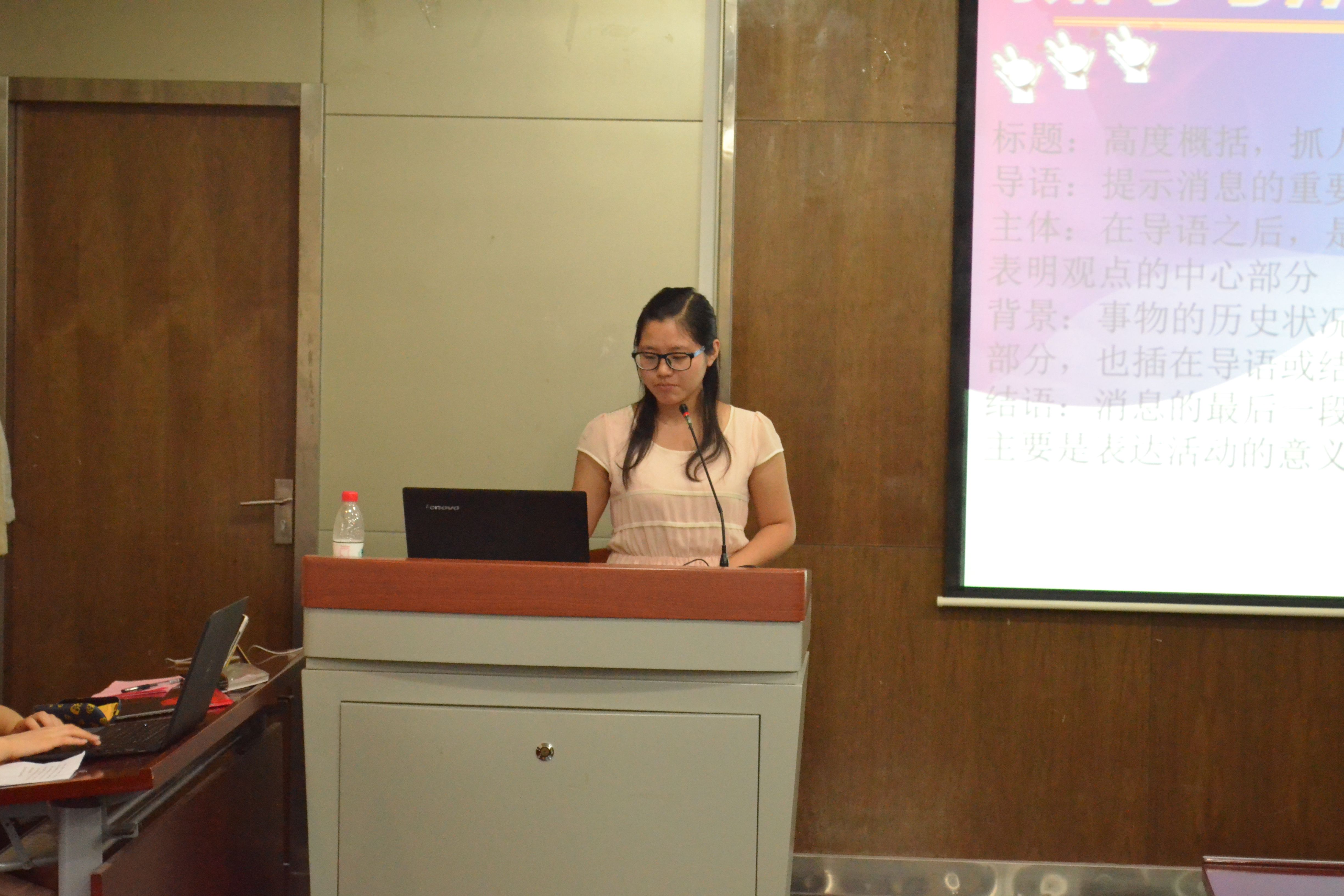 首先,偷拍副主任王春阳以“新闻的创作”为主题,从新闻稿的写作、活动照片的拍摄以及新闻稿的上传机制三方面进行了详细的解读。在强调新闻稿的准确性、时效性与真实性以外,她指出,要想写出一篇高质量的新闻稿,写好第一段是关键,倒金字塔式的内容堆叠会使整篇文章看起来更加层次分明,结尾处活动意义的总结则要言简意赅,突出重点。