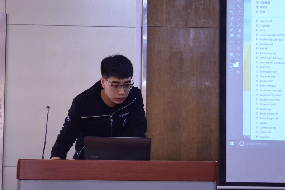 在培训会的最后,媒体部部长杜依诺同学为新部员们讲解了Photoshop软件的功能以及使用技巧,从基本图层概念到各项基础技能,从数据设置到快捷键的操作,由浅入深,层层递进。在场的部员们打开了自己电脑上的Photoshop软件,跟着杜依诺同学一步一步的操作,渐渐熟悉了相关的使用技巧。杜依诺同学对Photoshop软件的熟练操作及应用为提升技能培训的质量提供了有力的保证。并且,杜依诺同学使用图片结合实际操作对Photoshop软件各个功能的深入介绍更是使得同学们能够及时发现问题并得到解答。