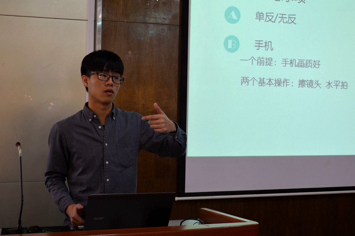 首先,记者团部长袁瑞鸿同学为在场新部员详细讲解了新闻摄影基础知识以及相关技巧。他首先详细阐述了新闻摄影的基础本概念以及基本素养,紧接着以构图、采光、内容等摄影技巧方面的内容进行了深入简出的讲解,并带领同学们拿起手中的手机,一起实践操作手机摄影的技巧。而后,袁瑞鸿同学还用一些不符合新闻拍摄要求的图片举了反例,加深同学们的印象,希望同学们能在其中学会举一反三,灵活应对问题。最后,他从新闻写作、写作注意事项、新闻上传机制等三方面为新部员们讲解了新闻写作的具体形式,重点讲解了新闻写作五要素以及新闻写作的“金字塔型”结构,并结合实例给大家分析了具体写作形式,强调了新闻用语准确简练、客观、时效的特点。