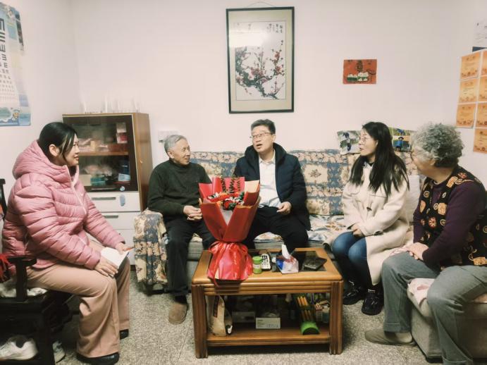 在田秋占老师家中,师生一行首先向田老师致以节日的美好祝愿。宁书记格外关心田老师的退休生活状态,了解田老师生活情况、日常起居,耐心倾听老教师的需求与想法。