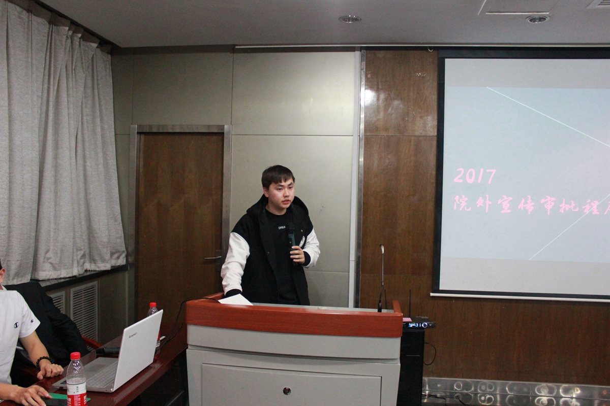 学生会办公室部长潘凌峰同学则是从公寓橱窗海报宣传审批要求出发,类推到篮球场宣传栏、食堂电子屏幕及校园网登录界面三个方面。他详细讲解了偷拍 外宣传的基本章程制度以及注意事项,提出“未雨绸缪”四字箴言,告诫同学们校外宣传要提敲定,提前审批。简明扼要地对各种宣传方式的注意要点、操作程序及步骤进行了详细剖析。