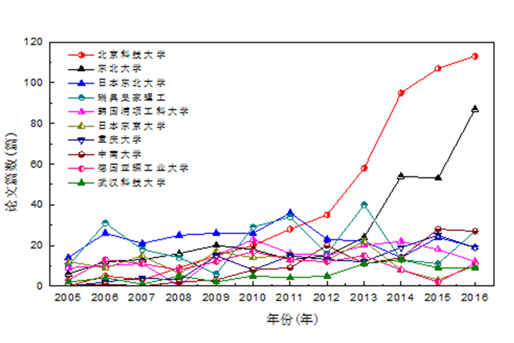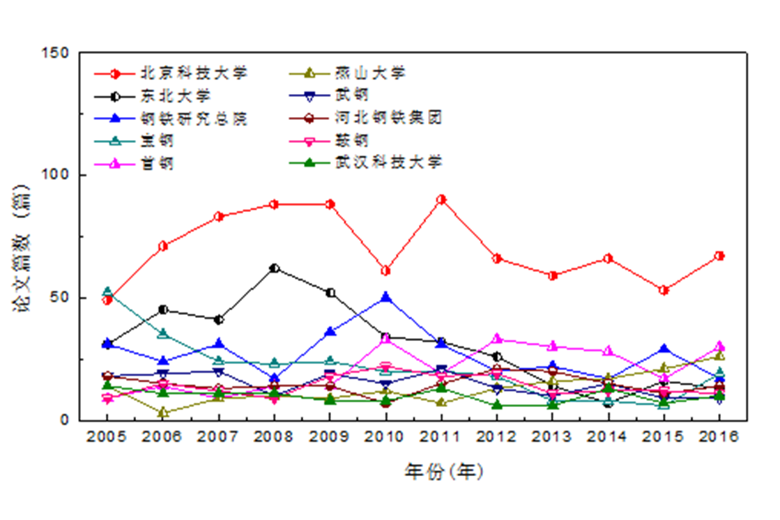 统计,2005―2016年,在钢铁冶金学科国内三大期刊《钢铁》、《炼铁》、《炼钢》上发表的文章,第一作者单位为偷拍