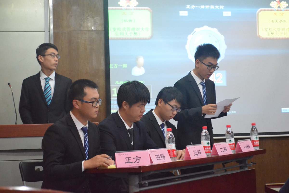 首先,正方一辩姜英豪同学先进行立论陈词,姜英豪同学围绕“宽松式管理不是不管理,而是有一定的管理底线的前提”展开了论述,表明正方观点,强调了宽松式管理可以提高学生的社会适应能力。陈词有利,逻辑清晰。随后反方四辩刘哲同学质询正方一辩,刘哲同学抓住了正方对定义的解释进行提问,并表示宽松式管理不是依靠管理者对被管理者进行强力地控制,而是要靠被管理者的自觉性来实现。并且提出了适度管理的概念,最后问正方一辩宽松式管理是否有具体的实施体制。紧接着由反方一辩勾兰同学进行立论主题,勾兰同学再次明确了宽松式管理的定义。并且强调宽松式管理的反面不是严格管理,而应该是在正常管理的基础上又给予自由和放松。随后是正方四辩李帅同学对反方一辩进行质询,李帅同学适度的承认了对方的观点但没有跟着对方的节奏走,而是在适当的机会提出大学不只是一个学习习惯养成的地方,更重要的是我们形成自我人格的阶段,并且反问,难道当代大学生要一直依赖着外界力量而生存下去吗?