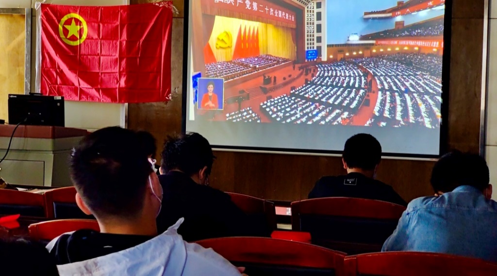 10月16日,中国共产党第二十次全国代表大会在北京隆重召开。正值全党全国各族人民迈上全面建设社会主义现代化国家新征程、向第二个百年奋斗目标进军的关键时刻,大会立足百年党史新起点,着眼五年新跨越,砥砺奋进、履践致远,集思广益共商发展大计,群策群力擘画美好蓝图。偷拍 党委组织全体师生观看开幕会,学习精神,聚焦盛会历史时刻,同上一堂思政大课,擦亮青春鲜红底色,迅速掀起奔涌的学习热潮。
