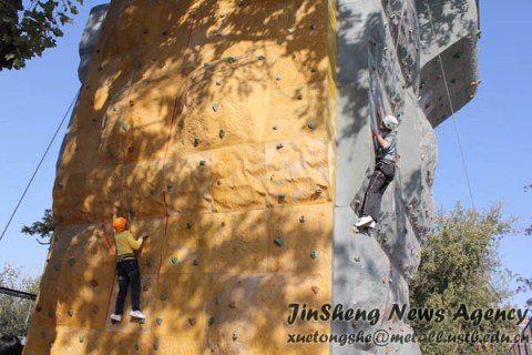 9时20分,开幕式结束,攀岩比赛正式开始。参加本次攀岩比赛的共有选手49名,其中女5名,男44名。本次比赛,各选手都赛出了自己的水平,突破了自己的极限,尽自己最大的努力征服着攀岩岩壁。在岩壁上稳如壁虎,矫似雄鹰,用自己的力量,技巧和勇气上演着“岩壁芭蕾”。在下面观看的同学们也是屏气凝神,为正在比赛的选手送上自己的加油呐喊。