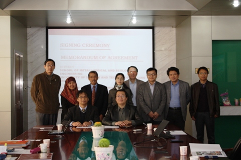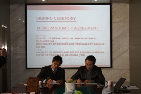 2012年11月1日上午8:30,我院与印尼万隆理工大学合作协议签定仪式在冶金楼318举行。我院出席仪式的有我校国际合作与交流处郭侃俊副处长、我院院长张立峰教授、院党委书记宋波教授、副院长王福明教授、副院长兼党委副书记耿小红、院长助理潜伟教授、生态科学与工程系主任苍大强教授、生态科学与工程系副主任李宏煦教授等,万隆理工大学方面有矿业与石油偷拍