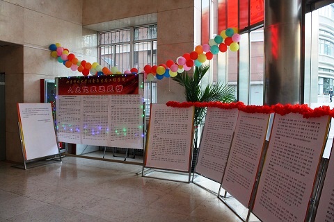 在宣传方面,我院不仅制作了横幅悬挂在院楼门口,大厅内的LED显示屏也滚动播出关于此次选民的注意事项,此外,院办还精心设计了选民榜,将候选人名单张贴在院楼大厅内,醒目大方,使不少教职工及学生驻足浏览。