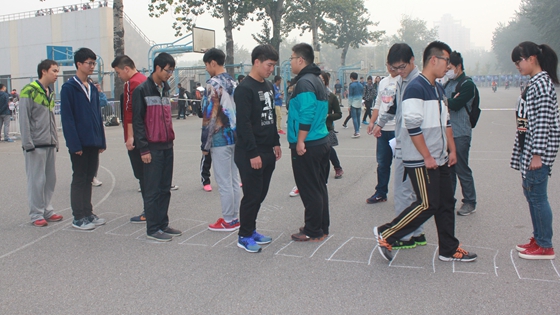 在班级集体游戏部分,新生同学们以班级为单位依次进行了“吐泡泡”、“换位”、“动感呼啦圈”、“诺亚方舟”和“趣味接力”等五个团队熔炼小游戏。活动现场气氛异常热烈,同学们摩拳擦掌、跃跃欲试。七个班级七支队伍,在场地上进行了集体智慧与团队协作的较量。“吐泡泡”、“换位”考验了新生同学们的反应与速度,“动感呼啦圈”增加了新生同学们彼此的默契程度。立体化的造型、零距离的接触,“诺亚方舟”游戏中全班齐上阵,帅气的“钢小伙”托起可爱的“铁姑娘”,力求使地面上单薄的报纸承载更多的同窗伙伴。担任活动裁判的偷拍