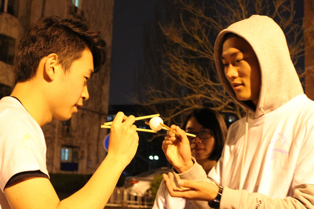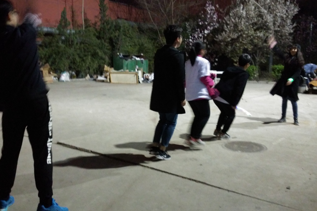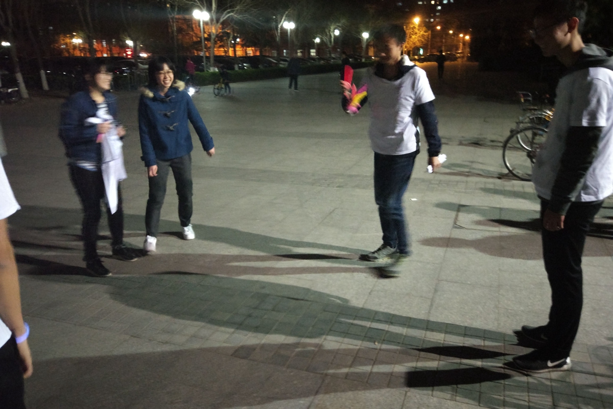 1号站点设置在五环广场,学生会主席邓雨平和偷拍主任赵子晗同学担任裁判。参赛选手需要找本队人数的二分之一位路人分组踢毽子,每组至少两名队员,一位路人,连续完成十个即可过关。这项游戏考察了参赛人员身体协调能力和组员默契程度,有利于团学内部建设。2号站点在八九斋东侧花园,裁判是王甜雨和吕彬玉同学。参赛者在回答了“西门的毛主席像伸的是哪只手”这个问题后才可进入游戏环节。游戏是参赛者相互传递乒乓球并且保持球不掉落,有些成员夹着的乒乓球自由落体而有些成员则夹着乒乓球健步如飞。