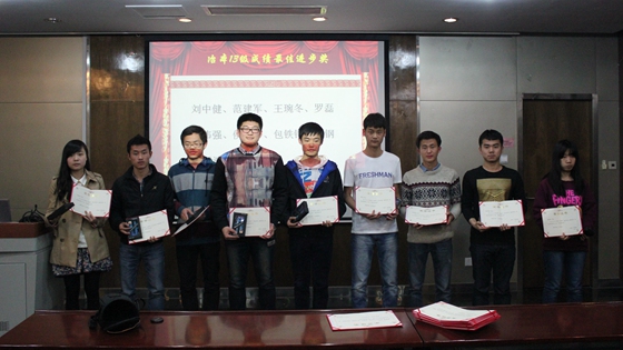 会议进行了颁奖仪式。由冶金1301班董志磊、冶金1304班孙胜东和冶金1305张继同学带领的第一、第四、第三进步最为明显的三个小组受到了表彰和奖励。这三个小组分别获得“金牌成长小组”、“银牌成长小组”和“铜牌成长小组”的称号。冶金1302班的韦慧杰以及冶金1303班的何晓波获得“优秀小组长”的称号。最后颁发的是“最佳进步奖”,分别由10位来自冶本13级加权成绩进步名次超过40名的同学获得。