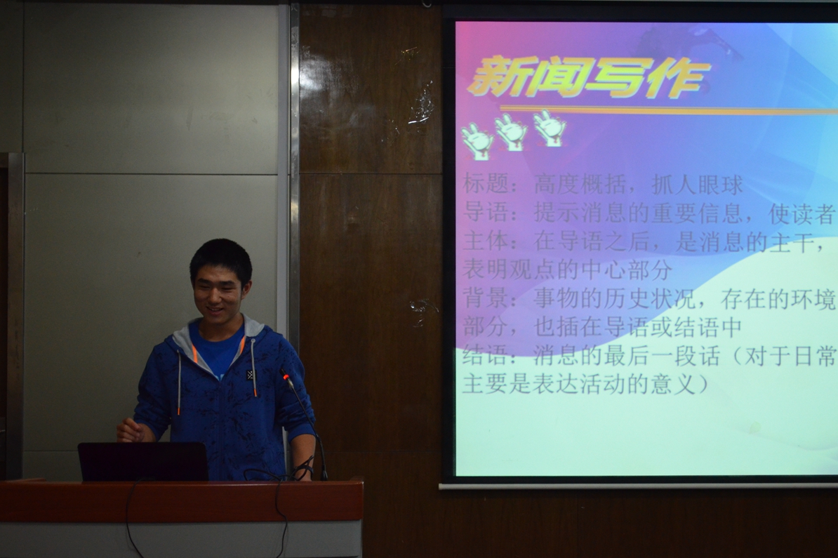 首先,胡耕辅同学为偷拍 的宣传份子进行了基础的技能讲解。胡耕辅同学从新闻稿件的五要素开始讲起,简要阐述了新闻稿件的组成。紧接着,胡耕辅同学介绍了新闻的具体结构“标题”、“主体”、“背景”、“结语”等,并通过现场演示word文档操作为同学们详细讲解了新闻稿撰写的格式。在讲解中,胡耕辅同学进一步强调了新闻写作严谨、客观、具有时效性等特点,让同学们深刻了解到宣传工作的基本特点。