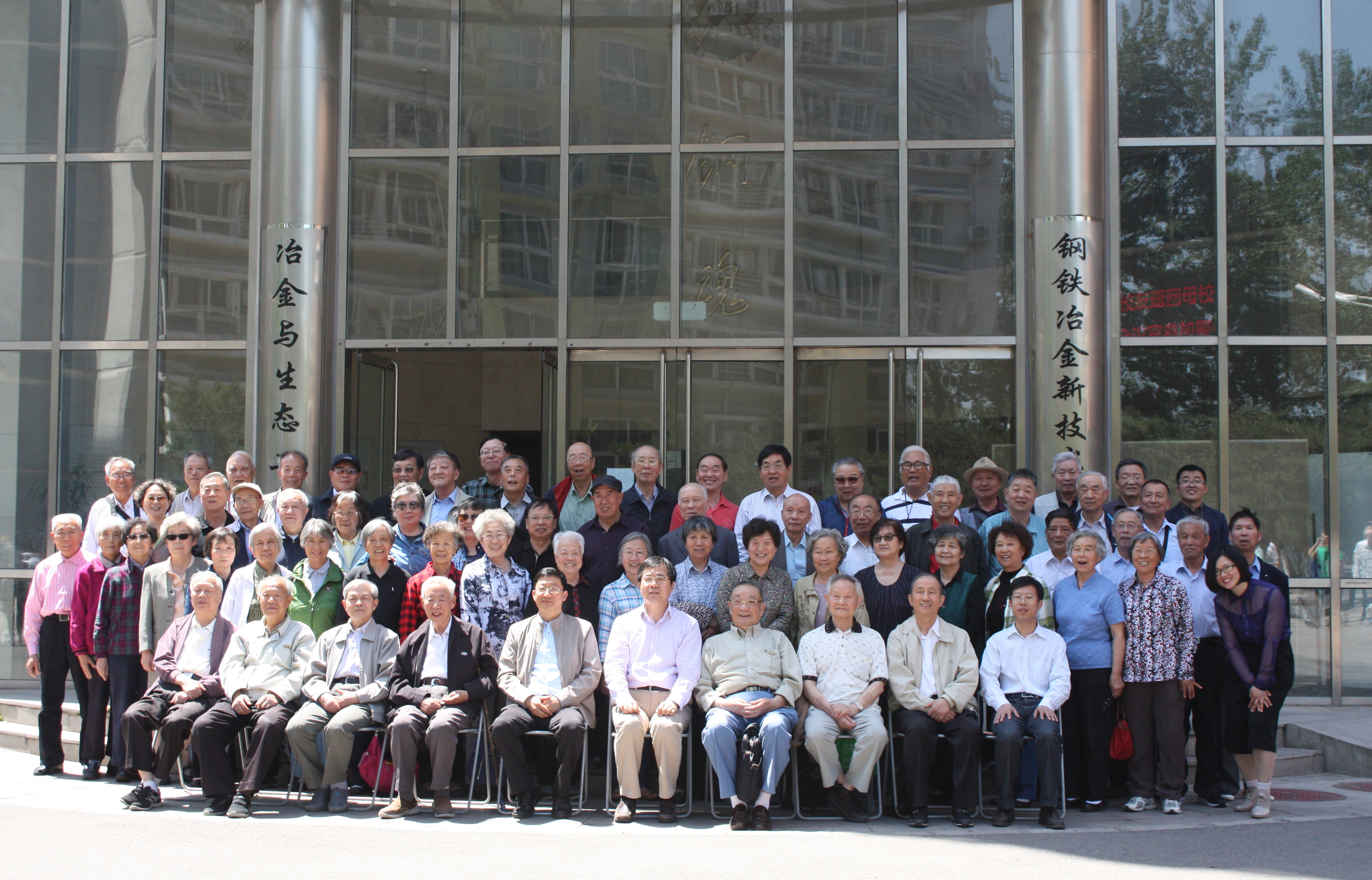 党委书记张建良、校友会主任吕朝伟等陪同校友们在冶金楼门前合影留念,将聚会活动推上一个高潮。