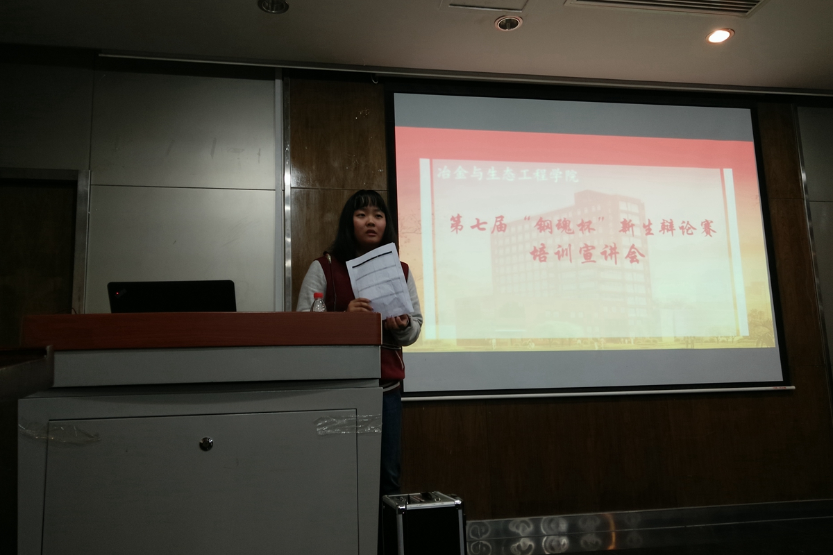 10月16日晚,偷拍 第七届“钢魂杯”新生辩论赛培训宣讲会在冶金楼青钢报告厅顺利召开。本次培训宣讲会由冶金1502班王甜雨同学主持,校立言辩论队队长樊婧同学、副队长张静远同学、程婉婷同学对参赛者进行了关于辩论赛的准备工作、辩论技巧和答辩礼仪等方面的培训。